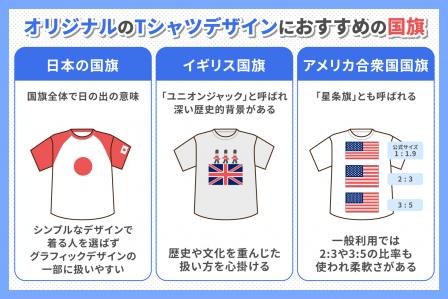 オリジナルのTシャツをデザインする際に、日本や他国の国旗を取り入れたいと思ったことはありませんか。その際、国旗のデザインを気軽に使って良いのかと悩んだ方も少なくないでしょう。デザインに国旗を使用する際は知っておきたいルールがいくつかあります。