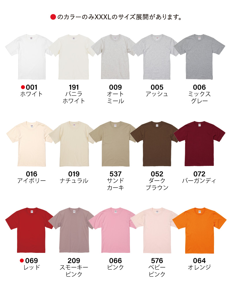 | 素材 | 基本:綿 100% アッシュ・オートミール:綿 98%、ポリエステル 2% ミックスグレー:綿 90%、ポリエステル 10% |