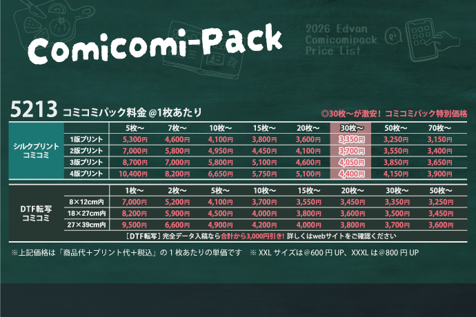 プリント料金は枚数によって料金が変わります。枚数とプリント箇所、色数をお知らせ下さい。プリント追加製作の場合も枚数によって料金がかわります。