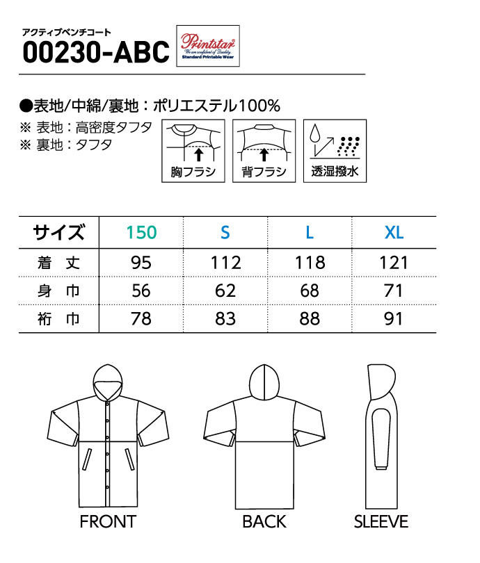 オリジナルTシャツTOP > 防寒ジャンパー・コート一覧 > Printstar 00230-ABC アクティブベンチコート ※在庫限り